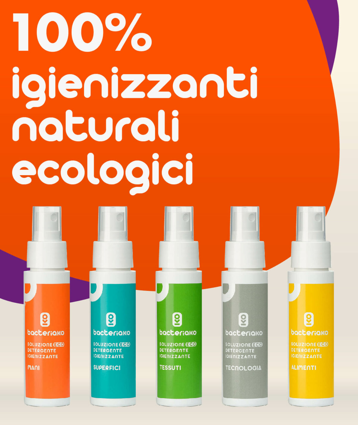 Atossico, naturale, green, versatile, sicuro, biodegradabile, ipoallergenico: sono solo alcuni degli aggettivi che possiamo usare per descrivere la nuova linea di igienizzanti BacteriaKO, realizzati partendo da due sostanze naturali: acqua e sale! Il segreto è nell’elettrolisi, la reazione chimica che dà vita all’acido ipocloroso, dallo straordinario potere igienizzante.